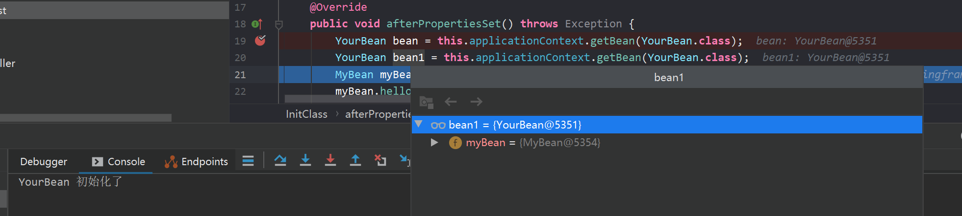 second , Three lines are finished , There is nothing to output , explain YourBean,MyBean All initialized once .