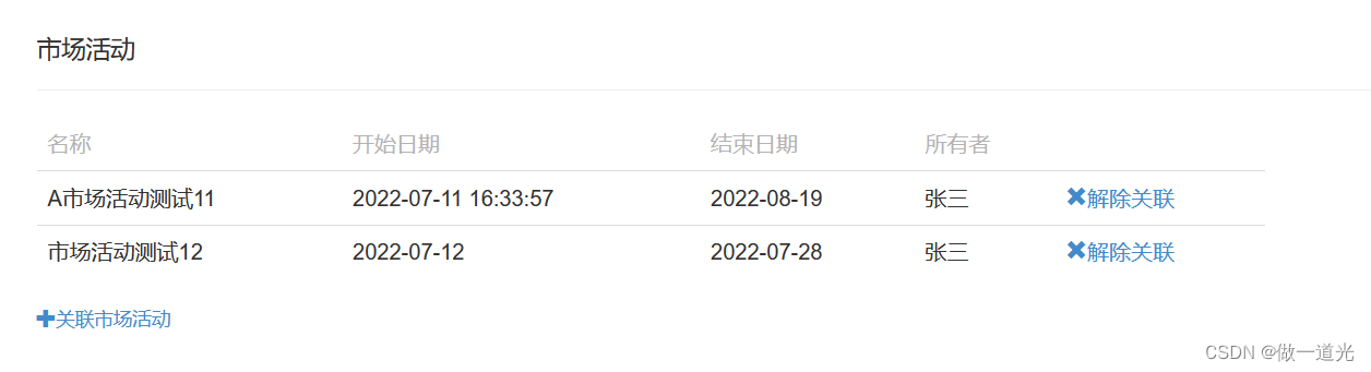 选中活动项,点击关联,关闭窗口,页面拼接出选中的市场活动,并显示出来