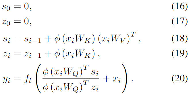 在下面的方程中,我们将方程 1 的transformer 层公式化为递归神经网络。得到的RNN有两个隐藏状态,即注意力记忆( attention memory)s 和标准化( normalizer)记忆 z 。我们使用下标表示循环中的时间步。