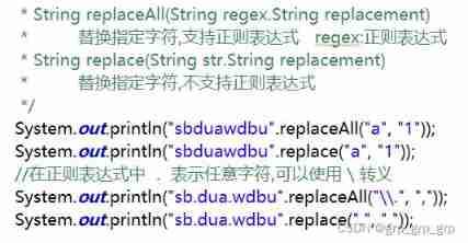 10 String replaceAll(String regex . String replacement); Replace specified characters , regular expression