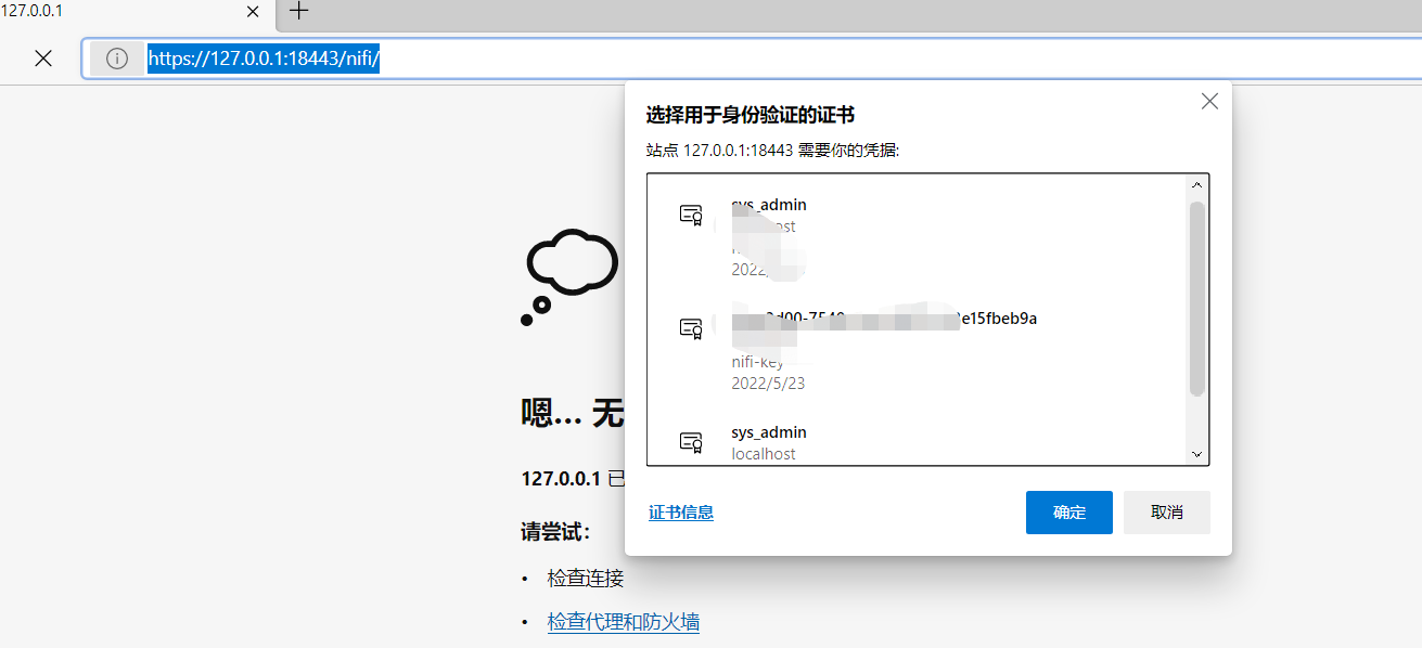 在浏览器中输入https://127.0.0.1:{你的自定义端口}/nifi/,会弹出选择身份证书的窗口,如下