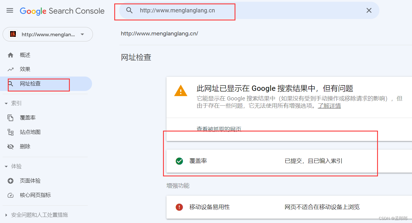 我们继续来到Google Search Console界面,然后点击左侧栏的网站检测,然后输入自己的某一个博客的完整的地址,然后回车。