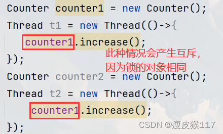 At present t1 adopt counter1 Object called increase, The lock is counter1 This object ,t1 What you get is counter1 The lock of this object ;