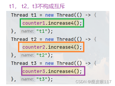 a. t2 The thread is waiting t1 Thread holds counter The lock of the object ——t1 and t2 In a mutually exclusive relationship ;b. t3 The thread gets counter1 The lock of this object . No thread to compete with him , So you can get it every time ,t3 and t1、t2 Does not constitute a mutually exclusive relationship .