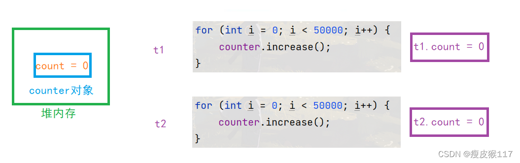 1. In the beginning t1 and t2 When the thread starts , In the main memory count Value is read into its own working memory , both of them count = 0.