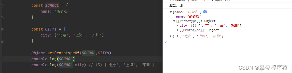 Obeject.setPrototypeOf(school,cities) // 支持所有的,即支持对象,也支持数组,理论上引用类型都可以使用。
