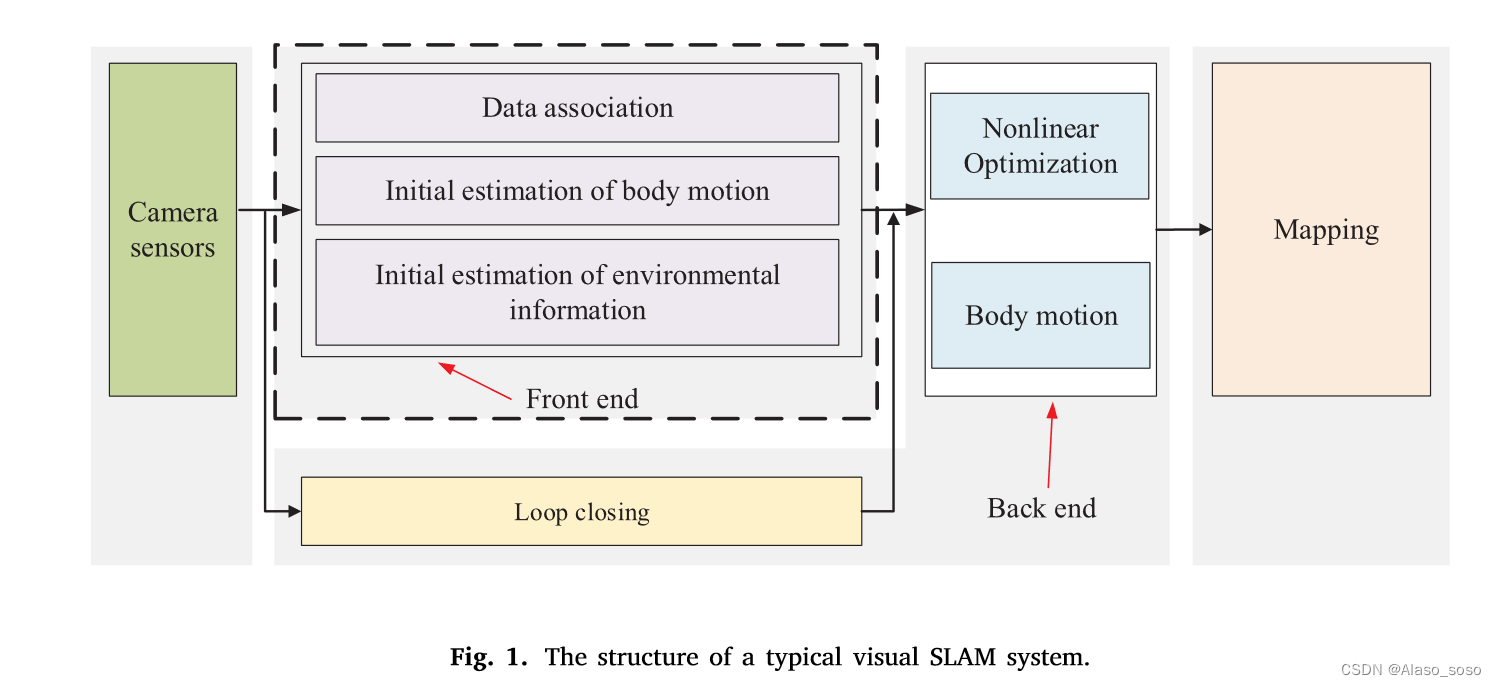 Vision SLAM The principle of vision SLAM The classical structure of the system can be divided into five parts . Camera sensor module 、 Front end module 、 Back end module 、 Closed loop module and mapping module . Pictured 1 Shown , The camera sensor module is responsible for collecting image data , The front-end module is responsible for tracking the image features between two adjacent frames , Realize the initial camera motion estimation and local mapping , The back-end module is responsible for numerical optimization and further motion estimation from the front-end , The closed-loop module is responsible for eliminating the cumulative error by calculating the image similarity in the large-scale environment , The mapping module is responsible for rebuilding the surrounding environment (Gao etc. ,2017).