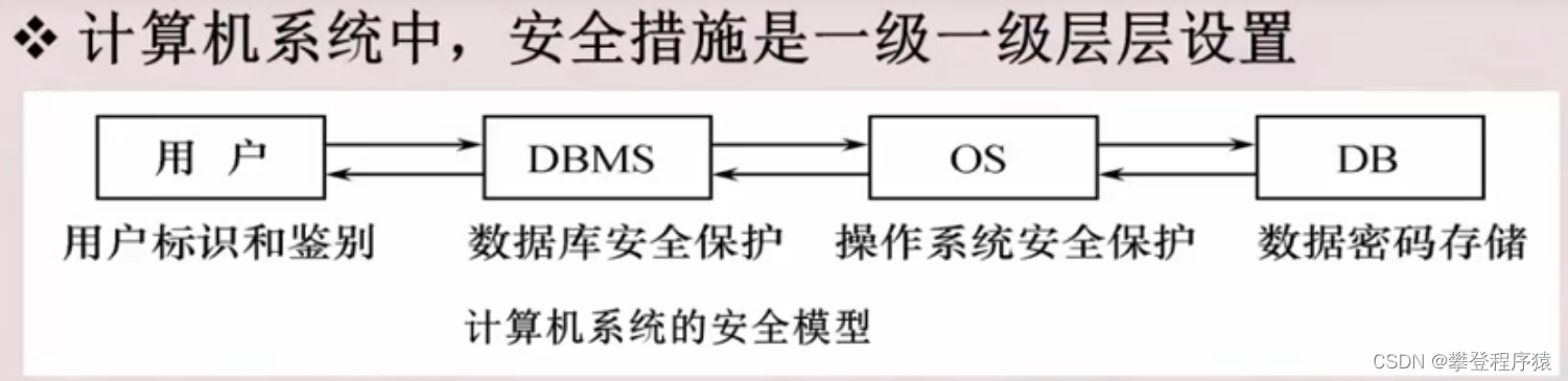 - 数据库管理系统提供的安全措施主要包括用户身份鉴别、存取控制和视图等技术。