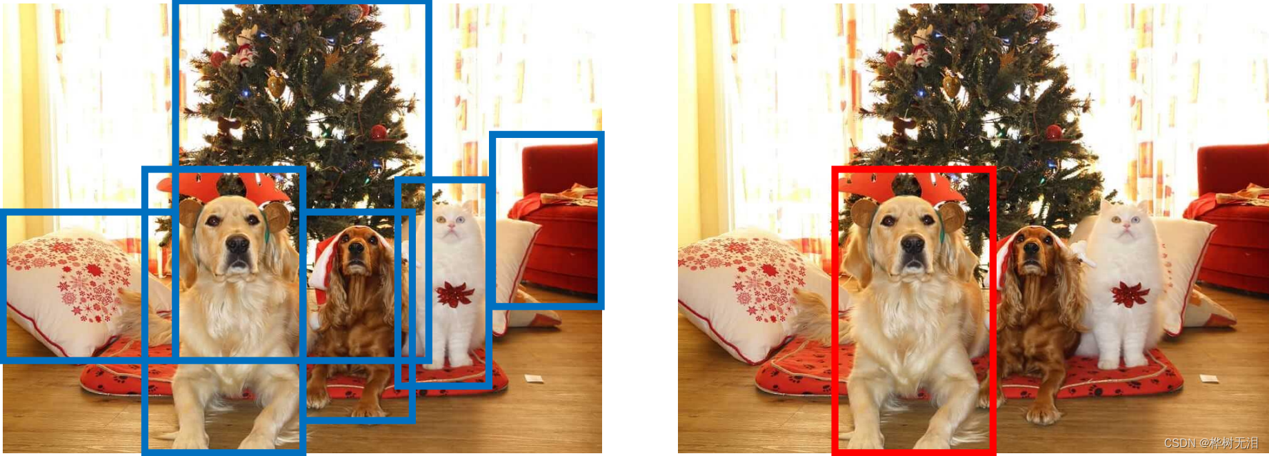 Select the box with the highest confidence , Then calculate the overlapping range of other boxes and this box IOU, If it is greater than a certain threshold, it will be rounded off .