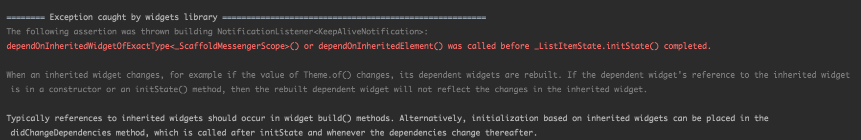 In this case, we can only guarantee Item When it's invisible SnackBar It can pop up normally , And if we just exit the page at this time , The following error prompt will still appear , because ScaffoldMessenger Also destroyed .