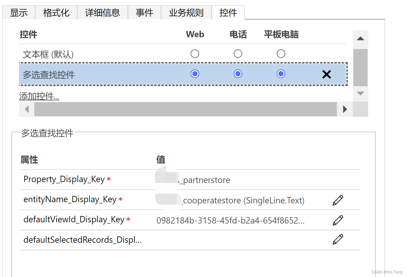 Click the multi select search control , The two properties in the following figure need to be set , One entityName( The entity you are looking for ), The second property is the view displayed when you click to find the form id