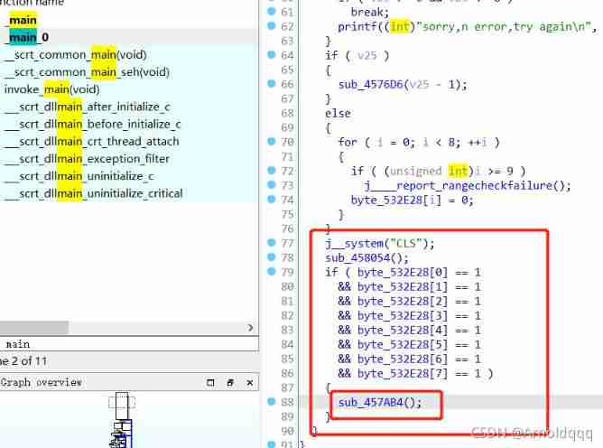 Find... In the function list on the left main function , Double click to enter and press F5 Decompile , Check the pseudo code