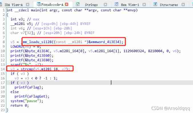 Check the pseudo code discovery judgment flag The logic of is the input value and v5 Variable value comparison ,v5 The value of comes from _mm_loadu_si128 Function pair xmmword_413E34 Variable handling Be similar to memset(), take xmmword_413E34 The value of is assigned to v5