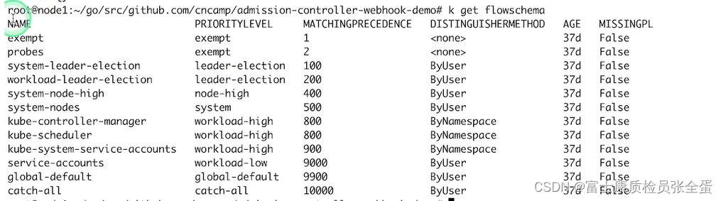这个是kubernetes1.22版本自带的,也就是你安装好集群之后,这些flowschema就已经定义好了。可以看到每个flowschema都有其对应的优先级,所以任何请求过来之后它都会从上到下去匹配,优先级数字越小的越优先匹配,它就通过优先级来决定它的限流策略是什么。