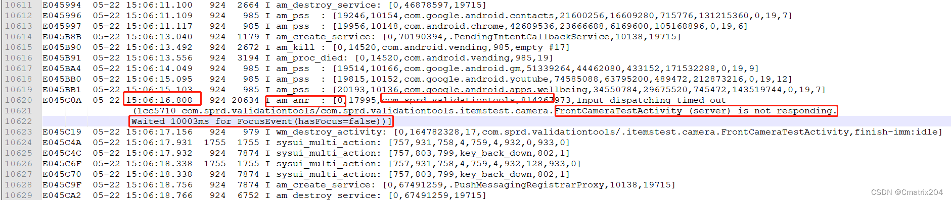 15:06:16 events.log里面 com.sprd.validationtools出现anr异常,异常持续时间10s,与帧error时间吻合,之后直接destory掉FrontCameraTestActivity。