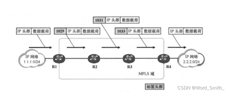 出站LSR --- (egress)--- 也是MPLS域的边界,完成标签的弹出动作。整个过程中,数据层流量流动的路径为R1-R2-R3-R4,这条路径我们称为LSP --- 标签交换