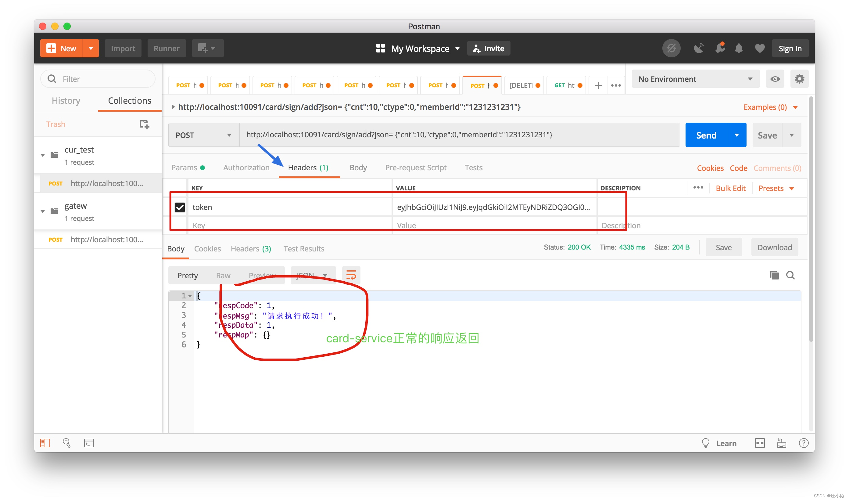 本次主要来验证特定下,是否会对 token 进行验证,由于 filter 是基于网关的 GlobalFilter,会拦截所有的路由请求,当是无须验权的请求时,则直接转发路由。先用 JWTUtils 工具,输出一个正常的 token,采用 Postman 工具进行“商场用户日常签到功能请求”验证,发现请求成功。