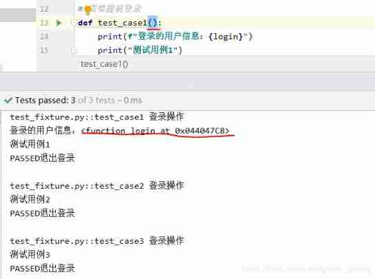 print(" Log out ")Be careful : If there is a call in the test case fixture Return value of method , Then the parameters of the use case need to be passed in fixture Method name , If it doesn't come in , The return value of the call does not directly display the information of the value , Instead, a memory address is displayed
