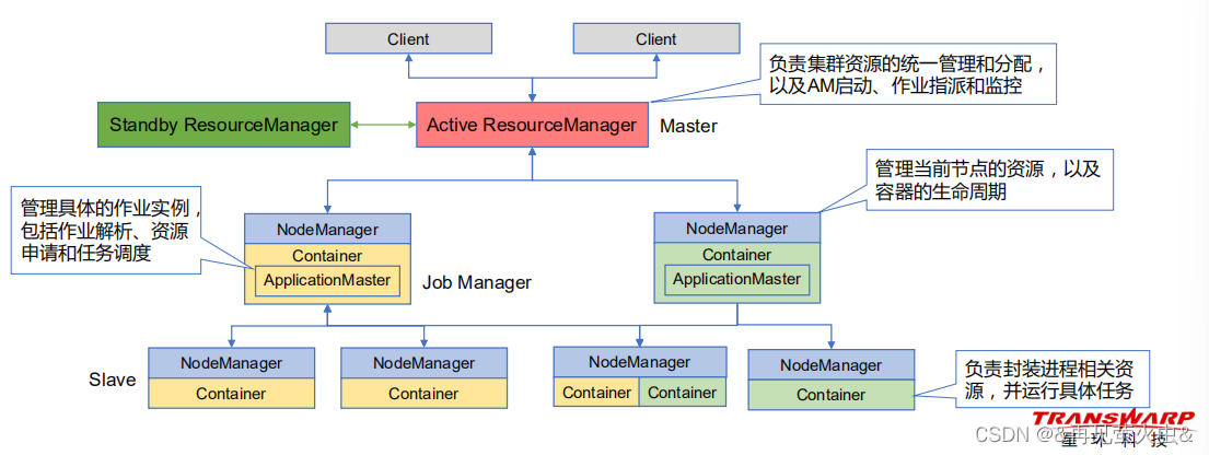 - Responsible for starting ApplicationMaster、 Job assignment and monitoring