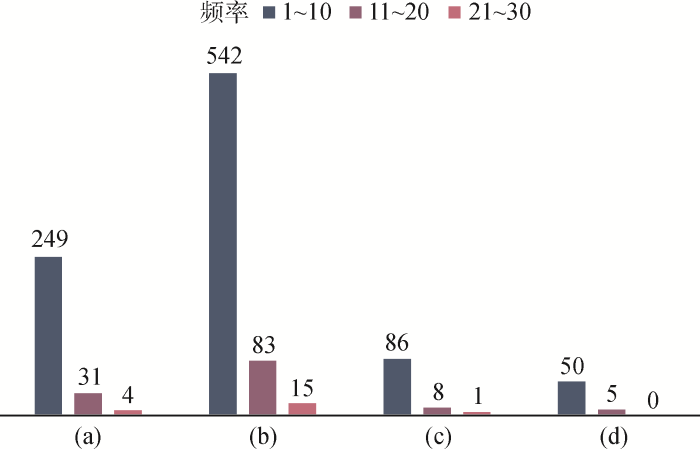 其中,图2(a)-图2(d)分别代表财经新闻、体育新闻、旅游评论、音乐评论。可以看出,选择合适的热度规则对于候选词的生成具有显著影响,随着热度频率的增加,候选词的数量呈阶梯式下降。这个现象与数据的来源有关,金融新闻和体育新闻经过编辑校对,从专业角度出发对事件进行阐述,写作过程中有固定的话术表达;而旅游评论和音乐评论由用户个人发表,从个人角度表达对旅游景点或者音乐的直观感受,没有固定的话术。