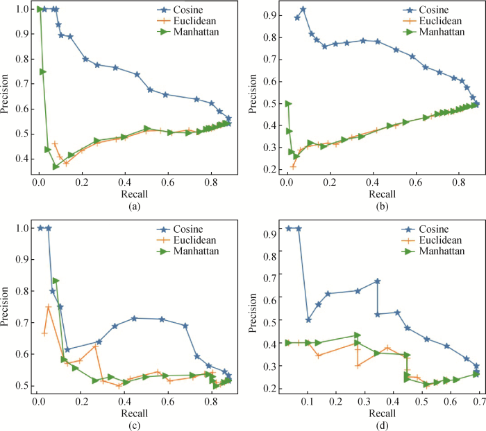 为进一步区别余弦相似度、欧氏距离和曼哈顿距离三种相似度度量方法的应用场景,将三种方法在4个领域数据库的精确率和召回率结果可视化如图3所示,其中图3(a)-图3(d)分别表示金融、体育、旅游、音乐。分析发现,利用新词候选词子词的词向量进行剪枝操作时,余弦相似度比欧氏距离或者曼哈顿距离在4个领域数据库均有更好的性能。基于此,接下来的新词发现实验采用余弦相似度进行剪枝操作。
