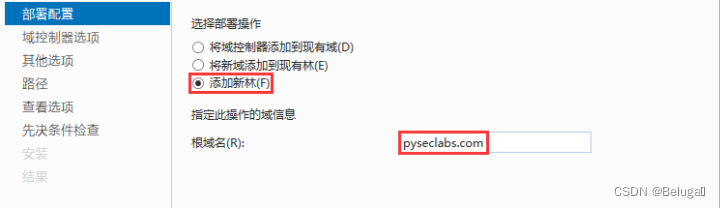 In deployment configuration , Select Add New Forest (F), And fill in the root domain name of the forged domain server , The root domain name depends on the host in the domain Windows 2012-1 Fill in the fields shown in pyseclabs.com