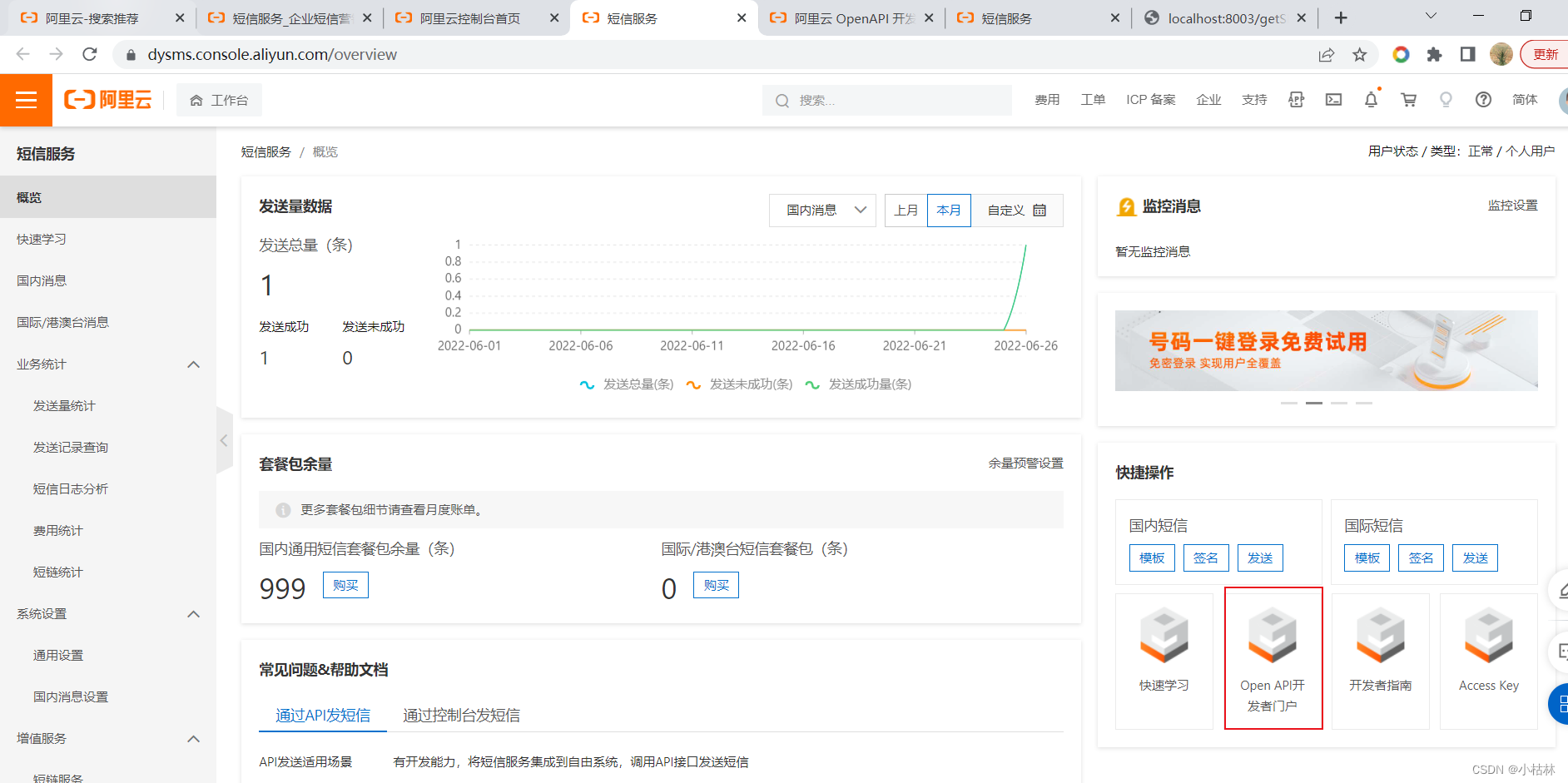 当前位置:网站首页>19:第三章:开发通行证服务:2:在程序中,打通阿里云短信服务;(仅仅是打通阿里云短信服务器,不涉及具体的业务开发)