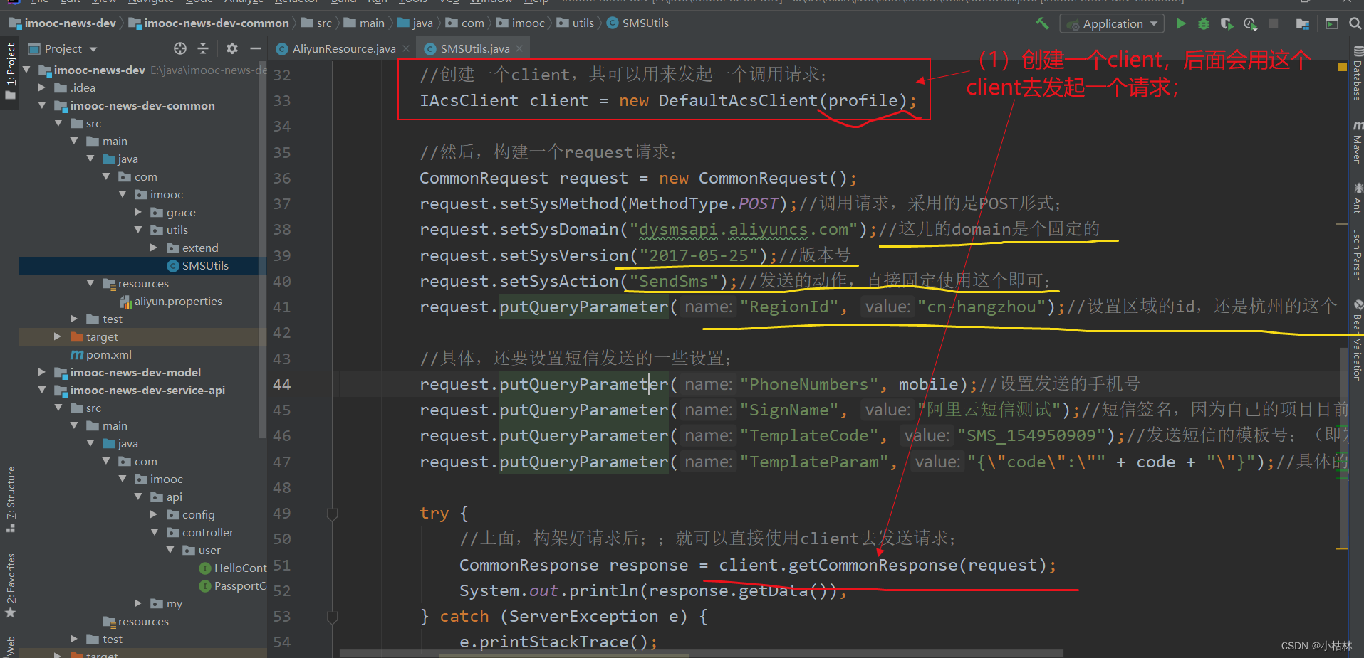 ● 阿里云短信服务,作为一个第三方的“工具”,我们把其写在了【imooc-news-dev-common】通用工程中;