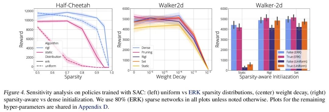 深度强化学习的稀疏训练。近年来,稀疏神经网络的使用迅速增长,特别是在计算机视觉领域,其吸引力主要来自用于训练和存储所需参数数量的减少,以及学习效率的提高。令人惊讶的是,在深度强化学习(DRL)中,很少有探索其使用的努力。本文对在各种DRL智能体和环境中应用一些现有的稀疏训练技术进行了系统调研,试图通过对在各种环境下训练的DQN、PPO和SAC智能体应用剪枝、静态、SET和RigL来了解DRL稀疏训练的情况。调研结果证实了计算机视觉领域的稀疏训练结果——在相同参数数量下,稀疏网络比稠密网络表现更好——在DRL领域同样适用。本文详细分析了稀疏网络的使用是如何影响DRL中的各组成部分的,并在结论中提出提高稀疏训练方法的有效性以及推动其在DRL中使用的有希望的途径。