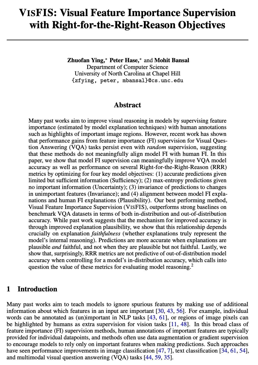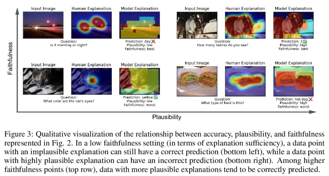 VISFIS:基于正确理由正确目标的视觉特征重要性监督。之前的许多工作旨在通过监督特征重要性(由模型解释技术估计)和人工标注(如重要图像区域的亮点)来改善模型的视觉推理。然而,最近的工作表明,即使在随机监督的情况下,视觉问答(VQA)任务的特征重要性(FI)监督的性能收益仍然存在,这表明这些方法没有将模型FI与人类FI进行有意义的协调。本文表明,模型FI监督可以通过优化四个关键的模型目标,有意义地提高VQA模型的准确性,以及在几个"正确的理由"(RRR)指标上的表现:(1)在有限但充分的信息下进行准确预测(充分性);(2)在没有重要信息的情况下进行最大熵预测(不确定性);(3)预测对不重要特征变化的不变性(不变性);以及(4)模型FI解释和人类FI解释的一致性(可信性)。其中表现最好的方法,视觉特征重要性监督(VISFIS),在基准VQA数据集上,在分布内和分布外的准确性方面都优于强基线。虽然之前的工作表明,提高准确性的机制是通过提高解释的可信度,但本文表明,这种关系关键取决于解释的忠实度(解释是否真正代表了模型的内部推理)。当解释是可信的和忠实的时候,预测会更准确,而当解释是可信的但不忠实的时候,预测就不会。令人惊讶的是,当控制了一个模型的分布内准确性时,RRR指标对分布外模型的准确性没有预测作用,这些指标在评估模型推理方面的价值值得怀疑。