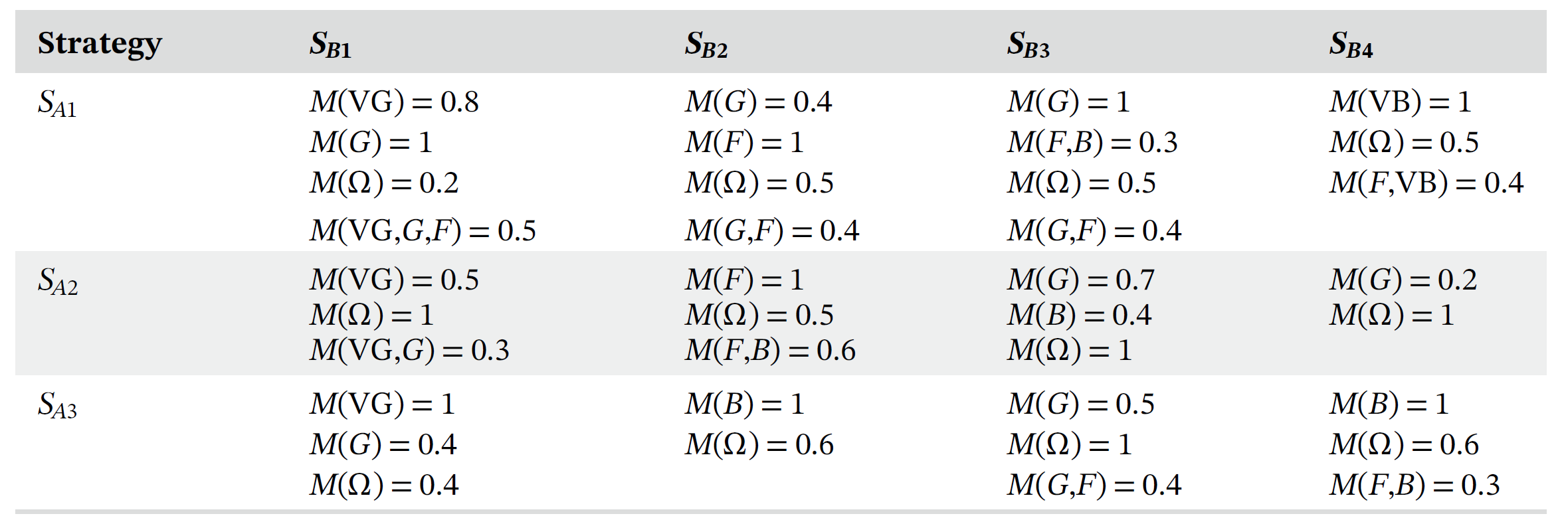 博弈中的支付矩阵可以根据语言评估和玩家策略进行构建。由于该博弈是零一博弈,仅有ALPHA或者BETA的支付矩阵被给定。表1展示的是ALPHA的支付矩阵,需要注意的是每一个评估都被表示为MBS的结构,以表达非特异性和不和谐。