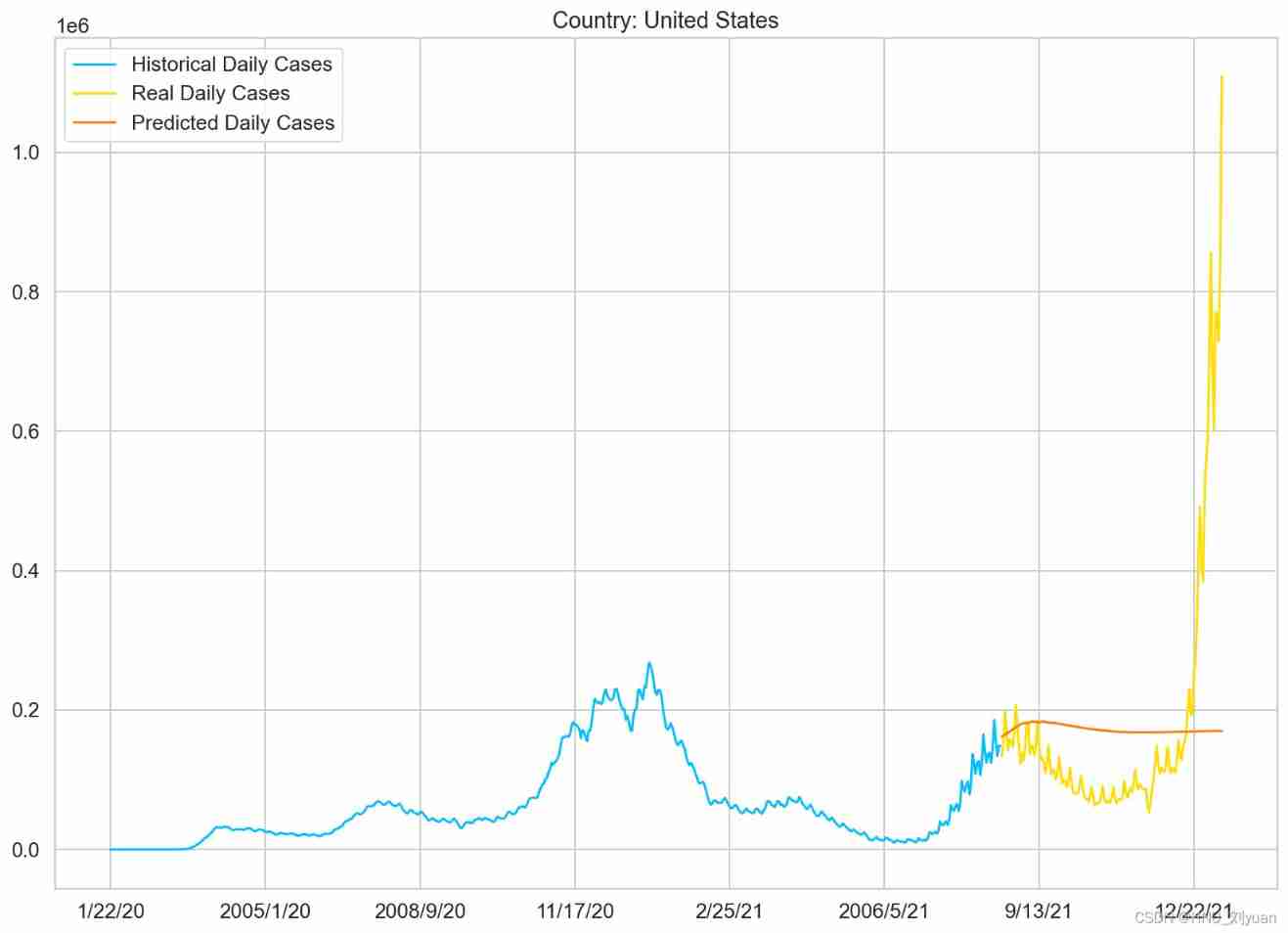 It can be seen from the forecast results that the model can not well predict the number of new people in a single day in the United States in the future , Because the virus is mutating , The back is more contagious , This information cannot be inferred from the previous sequence data , So the United States did not fight the epidemic well , Let the virus develop , Plus the mutation of the virus , Therefore, neither of the two models can well predict the future trend .