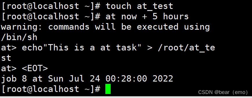 1.at 配置在5小时后,将 "This is a at task" 写入 root家目录中的at_test文件中