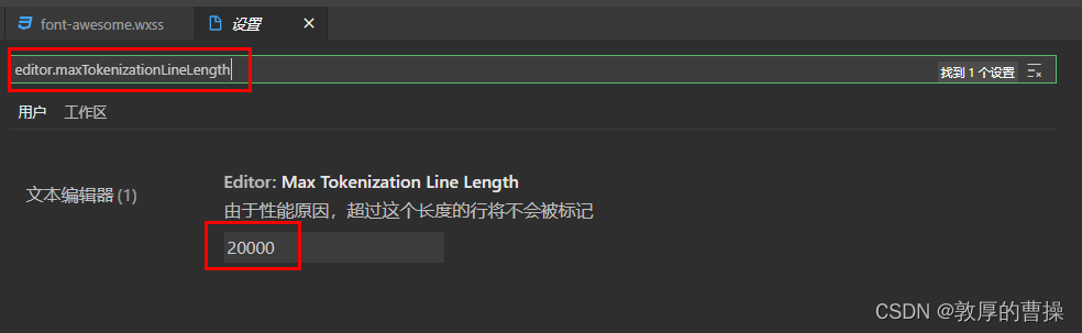 Be careful : If the following error occurs : For performance reasons , Skip tokenization for long lines . The length of a long line can be determined by “editor.maxTokenizationLineLength” To configure .