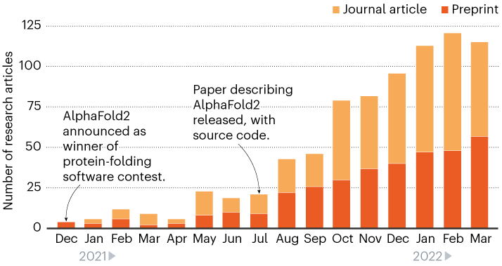 Nature调查显示,自AlphaFold开源以来,学术界(包括发表论文和预印本)对其的引用大幅上升。