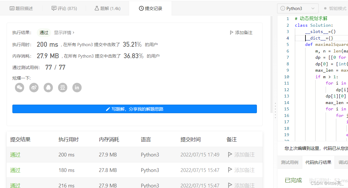 # Violence solution : As far as possible , Sweep the whole rectangle one by one class Solution: def maximalSquare(self, matrix: List[List[str]]) -> int: m, n = len(matrix), len(matrix[0]) # m That's ok n Column max_len = min(m, n) # The largest side of a square is m,n The lesser of the values for cur_len in range(max_len, -1, -1): # The side length of the current square i = 0 while i <= m - cur_len: # Vertical movement j = 0 next_i_len = cur_len while j <= n - cur_len: # Horizontal movement next_j_len = 1 cur_square = matrix[i:i + cur_len] # Current square for row_index in range(cur_len): row = cur_square[row_index] cur_row = row[j:j + cur_len] # Each row of the current square flag = 0 # Used to determine whether to exit the current outer loop (i Layer of ) for k in range(cur_len - 1, -1, -1): if cur_row[k] == '0': # Start with the last number in each line , As long as it equals 0, It cannot form the largest square at present next_j_len = max(next_j_len, k + 1) # Calculate the increment of the next horizontal displacement , Instead of just increasing each time 1, This saves a lot of time flag = 1 break # Because it cannot form the largest square at present , So just jump out of the loop (j Layer of ) if flag: next_i_len = min(next_i_len, row_index + 1) # Calculate the vertical movement increment , Instead of only increasing each time 1, This saves a lot of time break # Because there is 0 appear , So also jump out i Layer cycle else: # If the current squares are all made of 1 Composed of , Will not be from the top for Cycle by break Jump out of Then the current square is the largest square , direct return that will do print(f' The longest side :{cur_len}') return cur_len ** 2 print(f'{next_i_len}*' * 100) j += next_j_len # Horizontal movement i += next_i_len # Vertical movement2. Dynamic programming