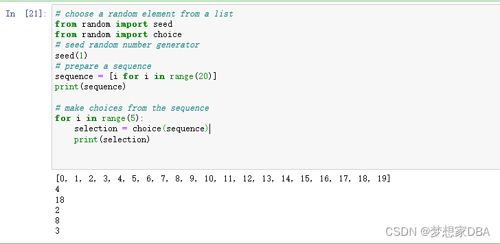 Random numbers can be used to randomly choose an item from a list. For example, if a list had 10 items with indexes between 0 and 9, then you could generate a random integer between 0 and 9 and use it to randomly select an item from the list. The choice() function implements this behavior for you. Selections are made with a uniform likelihood. The example below generates a list of 20 integers and gives five examples of choosing one random item from the list.