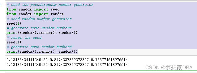 print(random(),random(),random())Running the example seeds the pseudorandom number generator with the value 1, generates 3 random numbers, reseeds the generator, and shows that the same three random numbers are generated.