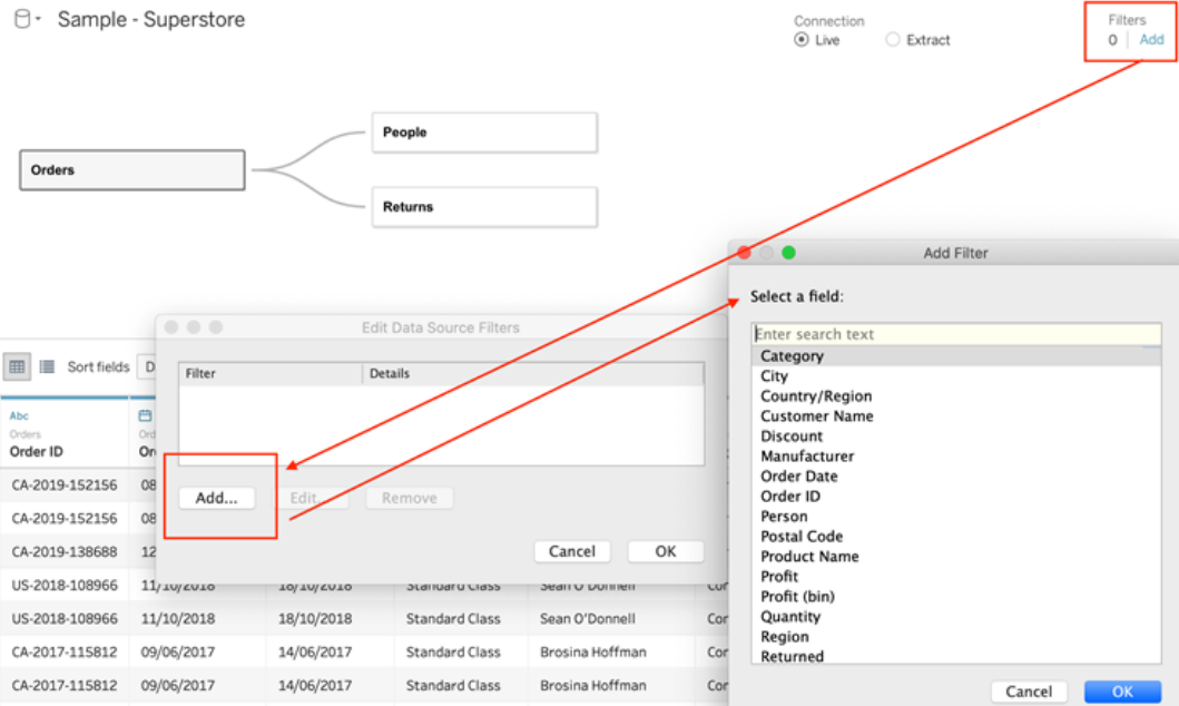 Level of Detail Expressions: Like basic calculations, LOD Expressions are also written as part of the query created by Tableau and therefore are done in the data source(Basic calculations can be performed either as row-level calculations or as aggregate calculations. So they can only answer questions at the granularity of the data source or at the level of detail of the visualisation. Level of Detail Expressions, on the other hand, can answer questions at any granularity.).