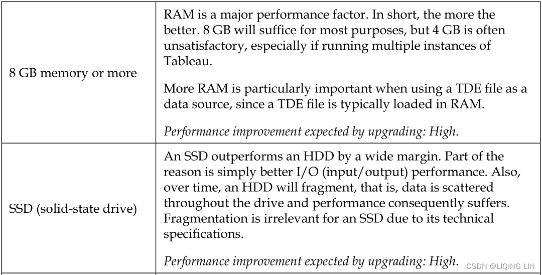 The number-one performance inhibitor[ɪnˈhɪbɪtər]抑制者,抑制剂,障碍 for Tableau Desktop that I have observed while training in many different companies is underpowered machines. Developers almost invariably have excellent computers. Analysts and other business users, regrettably, often do not. In many cases, a few modest upgrades can make a significant improvement. Unfortunately, upgrading a computer may be impossible at many organizations due to a variety of factors, and procuring a new machine may also be quite difficult. Therefore, in this section, we will consider both: optimal computer specifications and techniques for working with Tableau on underpowered machines.