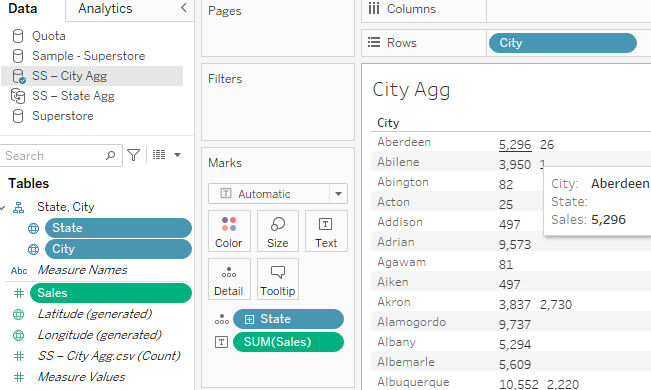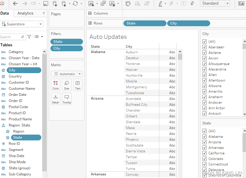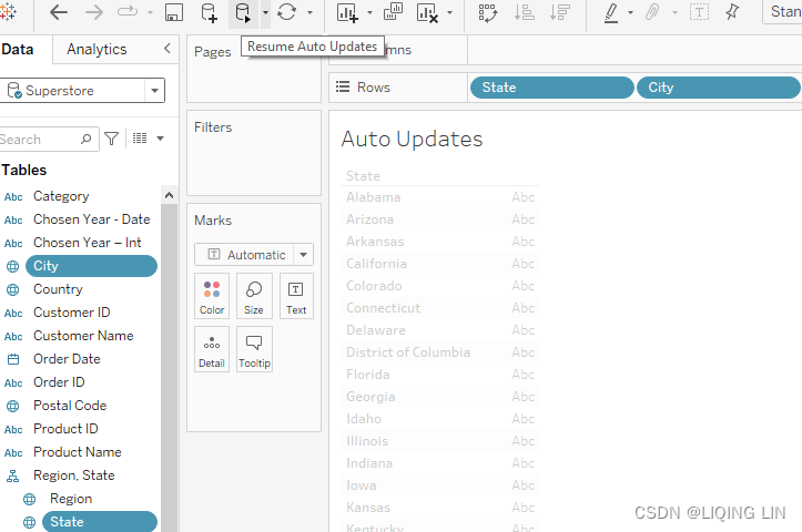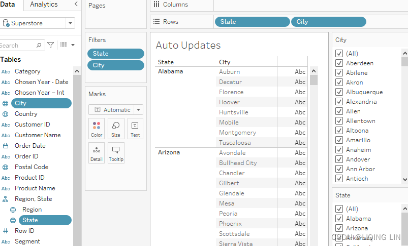 Figure 13.3: Auto Update Worksheet - 5. Place City on the Rows shelf to the right ofState. Note that the view does not update.