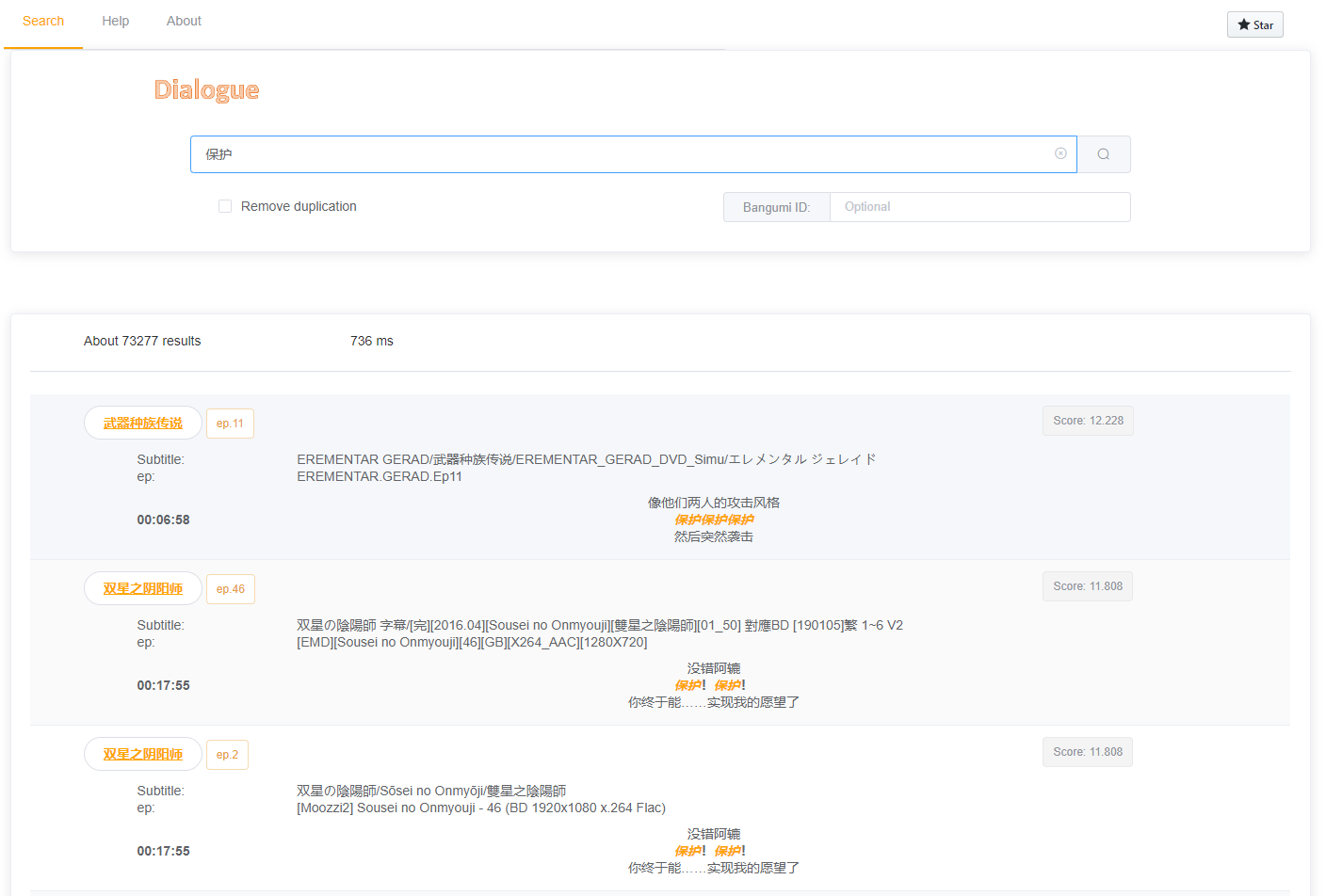 lookup Animation lines Website . For example, we search for protection , You can find the corresponding lines , The search results will show the time point of the line 、 Animation related introduction and other information , Easy content positioning .