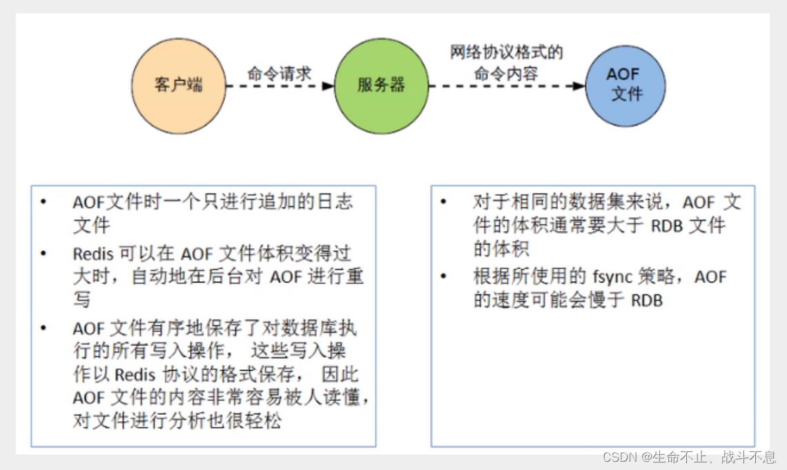 - AOF Persist to record every write to the server , When the server restarts, these commands will be re executed to restore the original The data of ,AOF Command to Redis Protocol append saves each write to the end of the file ,Redis Also able to AOF Background redoing of files Write , bring AOF The size of the file should not be too large .