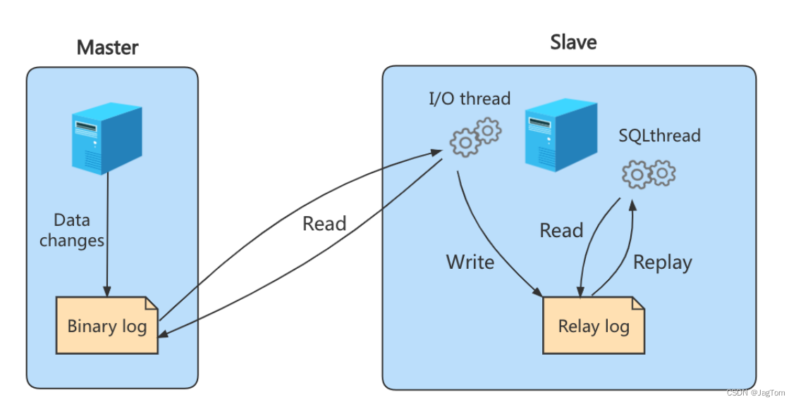 Slave Library I/O Threads Will connect to the main library , Send request update to main library Binlog. At this point from the library I/O The thread can read the of the main library Binary log dump thread sent Binlog Update section , And copy it to the local relay log (Relay log).