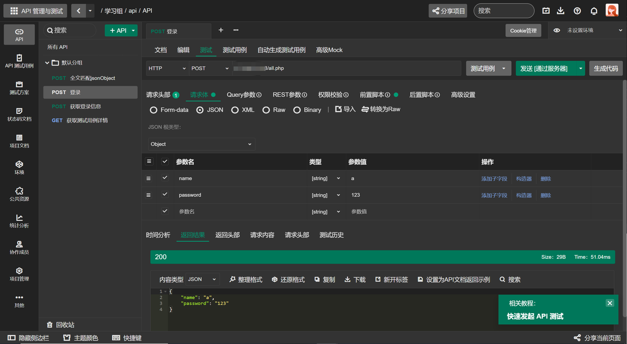 choice POST request , Input url , Select the request body type , Add the required parameters , Click Send , When the return parameter is 200 It indicates that the interface operation is successful , You can view it in the returned results .