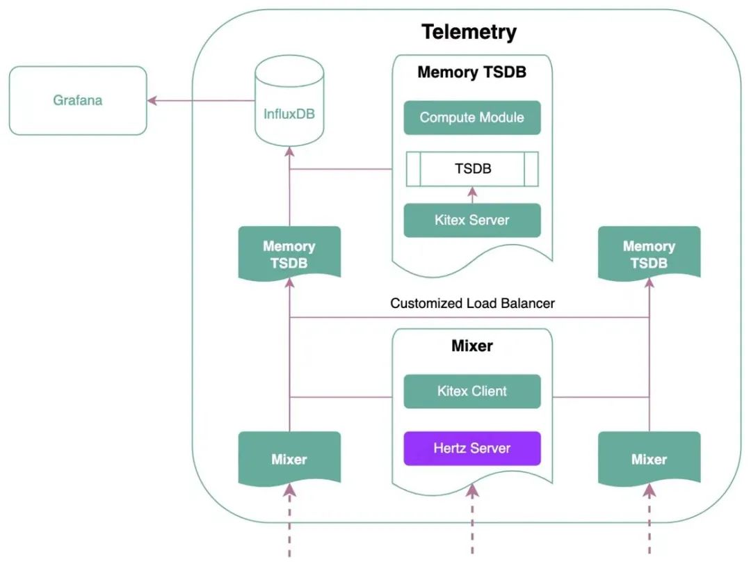 We from HTTP Layer or API After the layer receives the data , Use CloudWeGo Another open source framework for the community Kitex, So that the internal system can pass Thrift Efficient encoding and decoding to do data flow , In order to reduce the cost . At the same time, because we have relatively high self-defined traffic scheduling ability for data , So also used Kitex Expansible functions , That is, customize the load balancing policy , Change the corresponding indicators from API Layer to self-developed database for more complex index aggregation , Then calculate the whole process . We will also do asynchronous storage of indicators InfluxDB And so on for the observational Kanban in the back .