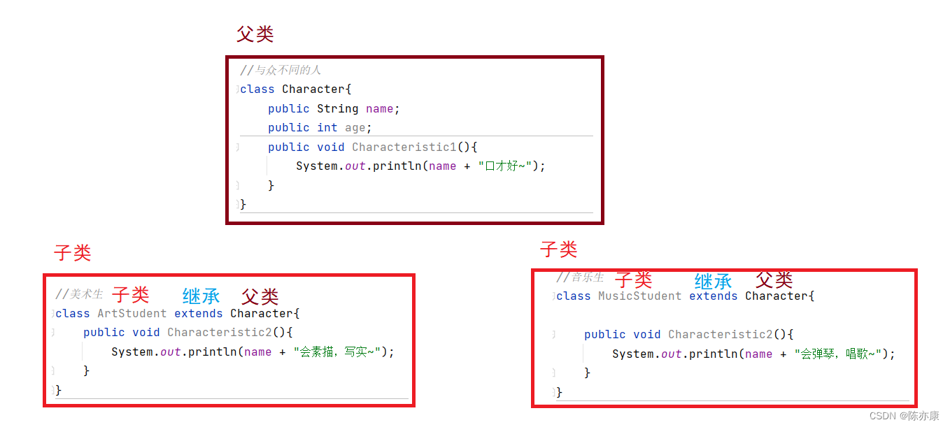 通俗来讲,就是将两个或多个类(“子类”或者叫“派生类”)的共同的特点抽取出来,放在一个类(“父类”或叫“基类”或叫“超类”)里面 ,对具有共同特点的代码实现重复利用,大大的减少了代码量。