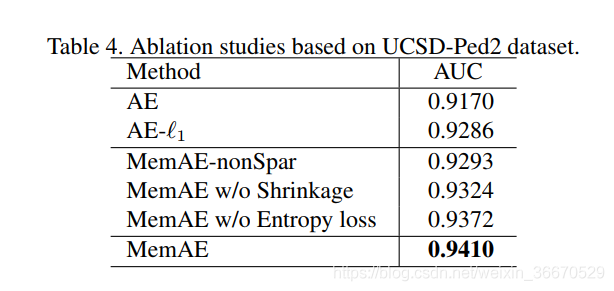 , This is related to MemAE Share the same encoder and decoder . As shown in the table 4 Shown ,AE-