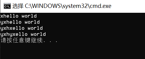 string& insert (size_t pos, size_t n, char c); iterator insert (iterator p, char c);void test() { string s("hello world"); s.insert(0, 1, 'x'); cout << s << endl; s.insert(s.begin(), 'y'); cout << s << endl; s.insert(3, 1, 'x'); cout << s << endl; s.insert(s.begin() + 3, 'y'); cout << s << endl; }
