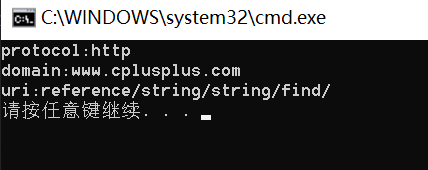 string url1("http://www.cplusplus.com/reference/string/string/find/"); string& url = url1; // 取出url中的协议 string protocol; size_t pos1 = url.find("://"); if (pos1 != string::npos) { protocol = url.substr(0, pos1); cout << "protocol:" << protocol << endl; } else { cout << "非法url" << endl; } // 取出url中的域名 string domain; size_t pos2 = url.find('/', pos1 + 3); if (pos2 != string::npos) { domain = url.substr(pos1 + 3, pos2 - (pos1 + 3)); cout << "domain:" << domain << endl; } else { cout << "非法url" << endl; } // 取出url中的uri string uri = url.substr(pos2 + 1); cout << "uri:" << uri << endl;